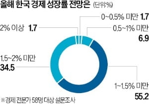 이번 설문조사에서 응답자의 55.2%는 올해 한국 경제성장률을 1~1.5% 미만으로 예측했다. 0.5~1% 미만(6.9%), 0~0.5% 미만(1.7%) 등을 포함해 1.5% 미만으로 보는 전문가가 63.8%였다. 정부와 한은 등의 전망치에 해당하는 1.5~2% 미만은 34.5%에 그쳤다. 염명배 충남대 경제학과 교수는 "미국 성장률이 올해 1%를 넘을지도 불확실할 만큼 대외 여건이 좋지 않다"며 "호재를 찾기 힘든 상황"이라고 말했다.