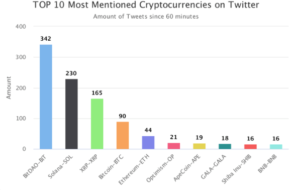4위~10위에는 비트코인(BTC, 90회), 이더리움(ETH, 44회), 옵티미즘(OP, 21회), 에이프(APE, 19회), 갈라(GALA, 18회), 시바이누(SHIB, 16회), 바이낸스코인(BNB, 16회) 등이 이름을 올렸다.