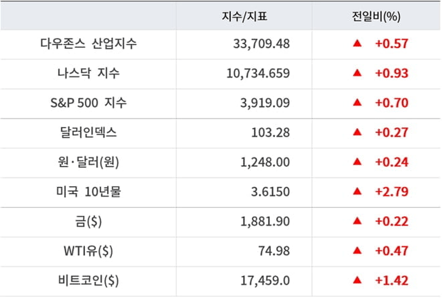 미국 10년물 국채금리는 전일대비 2.53% 상승한 3.60% 선에서 거래됐다. 연준 통화정책에 민감한 미국 2년물 국채금리는 파월 의장 발언에 내내 상승세를 보여 4.2790%를 기록했다.