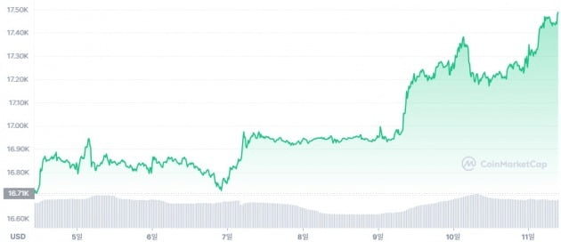 11일 암호화폐 시황 사이트 코인마켓캡에 따르면 이날 오전 10시 20분 기준 비트코인 가격은 개당 1만7486달러로 24시간 전보다 1.58% 올랐다. 이더리움도 24시간 전보다 1.05% 오른 1339달러에 거래됐다.
