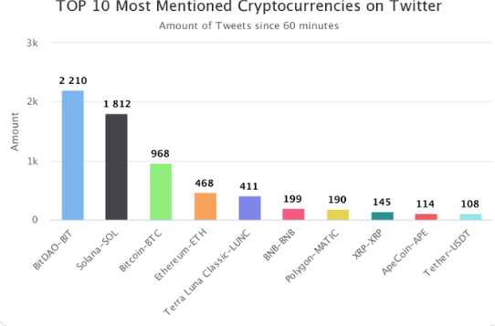 4위~10위에는 이더리움(ETH, 468회), 테라 루나 클래식(LUNC, 411회), 바이낸스코인(BNB, 199회), 폴리곤(MATIC, 190회), 리플(XRP, 145회), 에이프코인(APE, 114회), 테더(USDT, 108회) 등이 이름을 올렸다.