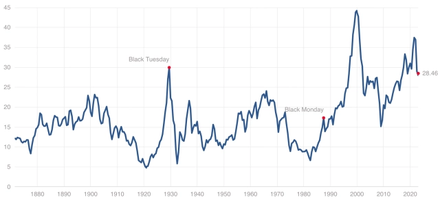 또한 경제 상황 둔화는 곧 기업 수익에 반영될 것이고 추가적 매도세가 없다면 P/E 수준이 높아질 것이다. 아래 차트를 보면 쉴러 PE 지수(Shiller PE Ratio) 평균은 작년에 크게 하락했지만 역사적인 관점에서는 여전히 높게 유지된다.