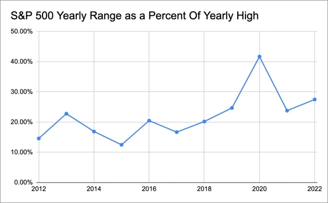 지난 10년 중 S&P 500 지수가 2022년보다 더 넓은 범위에서 움직였던 때는 2020년이었다. 당시 S&P 500 지수는 연고점보다 41.7% 낮은 수준으로 떨어졌고 저점과 고점은 1,600포인트 차이가 벌어졌다.