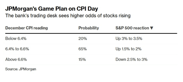 11일(현지시간) 블룸버그에 따르면 JP모간은 미국의 12월 CPI가 전년 동기 대비 6.4%~6.6% 상승으로 집계될 경우 S&P500 지수가 1.5%~2% 상승할 것으로 내다봤다. JP모간은 해당 시나리오대로 흘러갈 확률은 약 65%에 달한다고 분석했다.