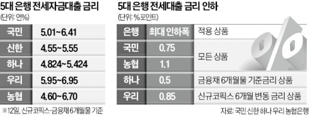 국민과 하나 등 다른 시중은행들도 새해를 전후로 주요 전세대출 상품 금리를 최대 0.5~1.1%포인트 인하했다. 이날 5대 은행의 신규 취급액 코픽스·금융채 6개월물(AAA·무보증) 기준 전세대출 금리는 연 4.60~6.95%로 작년 말 연 7%를 넘겼던 상단이 연 6%대로 내려왔다.