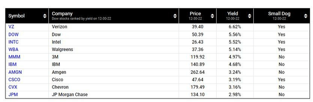 2023년 현재, 배당수익률이 가장 높은 다우존스 10종목은 다음과 같다.