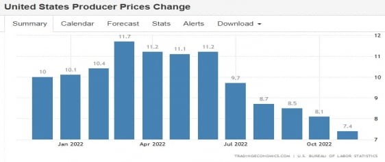 그리고 미국시간으로 18일에 발표되는 미국의 생산자 물가입니다. 전년 동기 대비로 확실히 둔화하고 있습니다.