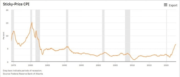 이럴 때 도움이 되는 게 경직적 CPI(sticky-CPI)입니다. 애틀랜타 연은이 발표하는 이 지표는 양다리를 걸치지 않습니다. 한 번 방향성이 정해지면 반대 방향으로 잘 움직이지 않는 비탄력적 가격 변수들만 모아놨습니다. 렌트비와 의료비, 교육비 등이 대표적입니다. 클리블랜드 연은 연구 자료를 보면 가격이 탄력적인 요소와 비탄력적인 요소를 나누는 가격 변동 빈도의 기준은 4.3개월이었습니다.