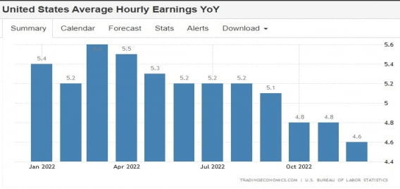 지난해 12월 시간당 평균 임금은 전월보다 0.3%, 전년 동월보다 4.6% 각각 늘어났습니다. 시장 전망치(전월 대비 0.4%, 전년 대비 5.0%)를 하회했고 전년 대비로는 2021년 8월 이후 최저치였습니다. 이게 추세적으로 하향 안정화되느냐가 관전 포인트입니다.