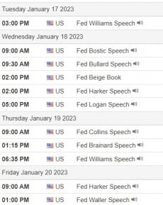 이렇게 상황이 안좋으니 피벗에 대한 기대가 커질 수 있는데요. 이에 대해 Fed 인사들이 매파적 발언을 쏟아낼 가능성이 큽니다. 2월1일 FOMC를 앞두고 다음주부터 블랙아웃에 들어가서 이번주가 사실상 마지막 발언기간인데요. 10여명이 출동합니다.