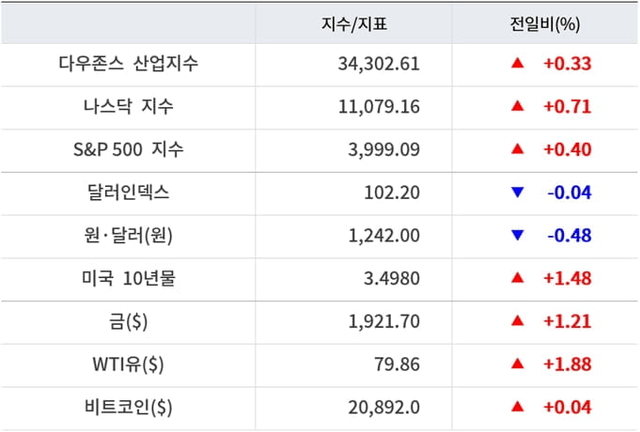 뉴욕증권거래소(NYSE)에서 다우지수는 전장보다 112.64포인트(0.33%) 상승한 34,302.61로 거래를 마감했다. S&P500지수는 전장보다 15.92포인트(0.40%) 오른 3,999.09로, 나스닥지수는 78.05포인트(0.71%) 상승한 11,079.16으로 장을 마쳤다.