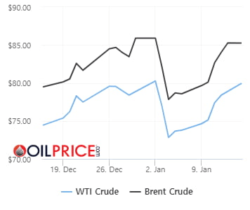 지난 13일(현지시간) 뉴욕상업거래소(NYMEX)에서 2월물 서부텍사스원유(WTI)는 전장보다 1.47달러(1.87%) 오른 배럴당 79.86달러에 장을 마쳤다. 지난주에만 8.25% 상승했다. WTI는 지난 5일부터 7거래일 연속 오름세를 이어가고 있다. 이 기간에는 9.6% 올랐다.