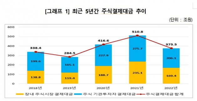 주식결제대금은 2018년 338조4000억원에서 2019년 284조5000억원으로 감소했다. 코로나19 사태 이후 시장 유동성이 증가하며 2020년 416조6000억원, 2021년 510조8000억원으로 늘었다.