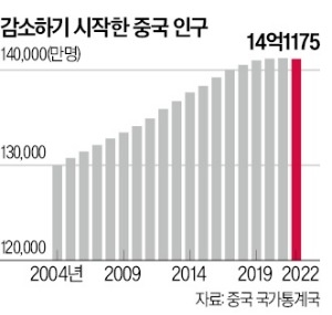 특히 인구 감소와 고령화는 중국 경제가 마주친 최대 암초로 꼽힌다. 국가통계국이 이날 발표한 중국의 2022년 말 인구는 14억1175만 명으로 전년보다 85만 명 줄었다. 중국의 인구가 감소한 것은 '대약진운동'에 따른 대기근으로 수백만 명이 굶어 죽은 1961년 이후 61년 만이다. 생산가능인구(16~59세)는 8억7556만 명으로 666만 명 급감했다.