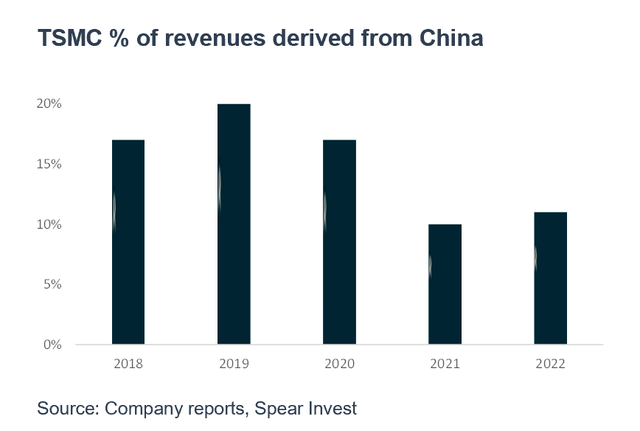 TSMC의 전망 자신감은 어디서 오는 걸까? 필자는 중국이라고 생각한다. 흥미롭게도 코로나 팬데믹 이전이었던 2019년에 중국은 TSMC 매출의 최대 20%를 차지했지만 지금은 11% 정도만을 차지하고 있다. 중국 매출이 20%로 회복되려면 수요가 1~2년 동안 2배로 늘어야 한다. 그렇게 되면 다른 모든 최종시장이 지금처럼 유지되는 경우 TSMC 성장률은 1~2년 내로 10% 이상을 기록할 것이다.