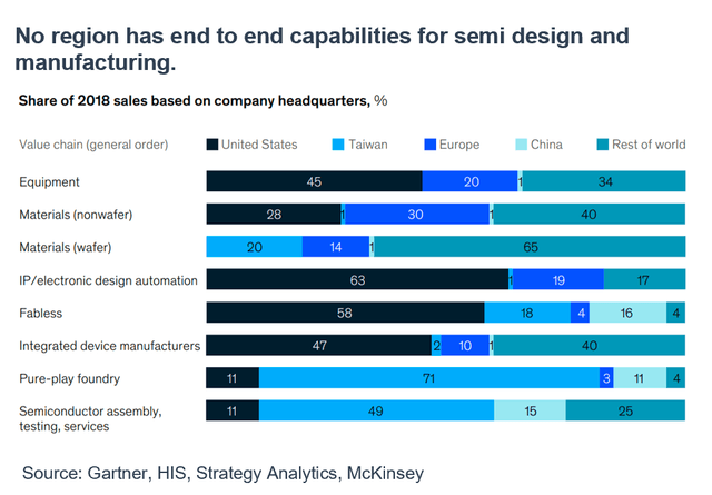 반도체 설계와 제조에 있어서 엔드투엔드(end-to-end) 역량을 가진 지역은 없다. 반도체는 엔비디아, AMD(NASDAQ:AMD)와 같이 하나의 기업이 한 지역에서 설계를 한 후, 또 다른 지역의 또 다른 기업 즉 TSMC와 같은 기업이 제조를 한다. 그리고 다른 제3자 기업이 조립을 하고 유통시킨다. 이 모든 과정을 통해 복잡도가 높아지고 재고 관리의 어려움도 커진다. 그렇기 때문에 반도체 공급 관리가 어렵고 잉여 재고가 잉여 공급 이슈를 악화시킬 수 있는 것이다.
