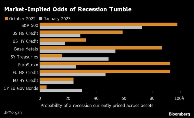 21일(현지시간) 블룸버그에 따르면 JP모간의 전략가 니콜라오스 파니기르초글루(Nikolaos Panigirtzoglou)는 "대부분의 자산군은 중국의 경제 재개, 유럽의 가스 가격 폭락, 미국의 예상보다 빠른 인플레이션 둔화에 의해 경기 침체 위험을 꾸준히 평가하고 있다"고 말했다. 그는 "시장은 10월보다 경기 침체 가능성이 훨씬 낮을 것으로 예상하고 있다"고 밝혔다.