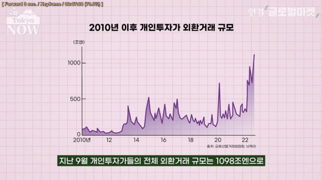 지난 9월 개인투자가들의 전체 외환거래 규모는 1098조엔으로 월간 기준으로 처음 1000조엔을 넘었다. 일본 외환시장은 레버리지(지렛대 효과)를 일으키면 증거금의 25배까지 외화거래를 할 수 있기 때문에 거래액이 급증했다는 분석이다.