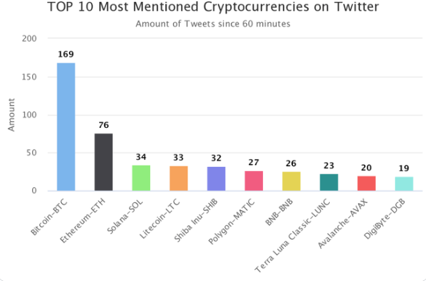 4위~10위에는 라이트코인(LTC, 33회), 시바이누(SHIB, 32회), 폴리곤(MATIC, 27회), 바이낸스(BNB, 26회), 테라 루나 클래식(LUNC, 23회), 아발란체(AVAX, 20회), 디지바이트(DGB, 19회) 등이 이름을 올렸다.
