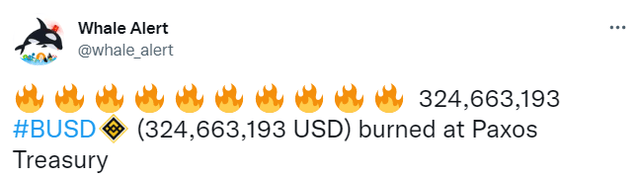 24일(현지시간) 가상자산(암호화폐) 트랜잭션 추적 사이트 웨일 알러트(Whale Alert)에 따르면 23일 23시 44분(한국시간)경 스테이블코인 발행사 팍소스가 이더리움(ETH) 네트워크에서 3억2466만3193BUSD를 소각했다.