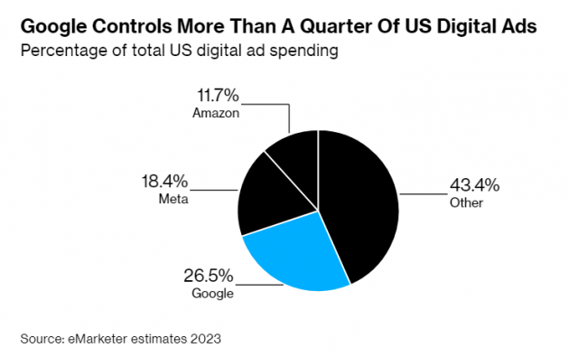 법무부는 구글의 독점적 지위 때문에 광고주가 온라인 광고로 지출하는 1달러 가운데 최소 0.3달러를 구글이 벌어들인다고 주장했다. 이마케터에 따르면 구글은 2786억달러 규모의 미국 디지털 광고시장에서 점유율 26.5%의 1위 사업자다. 메타가 18.4%, 아마존이 11.7%로 뒤를 잇고 있다. 법무부는 온라인 광고를 구매, 판매, 제공할 때 쓰이는 대부분의 기술을 통제하고 있다고 보고있다.