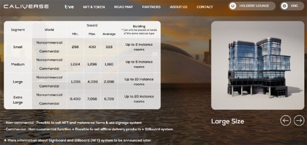 롯데그룹 계열 정보통신기술(ICT) 회사인 롯데정보통신이 인수해서 키우고 있는 칼리버스나 게임회사 컴투스의 컴투버스는 메타버스 내 부지를 판매해서 자금을 확보하려 하고 있다. 칼리버스는 NFT 땅과 빌딩을 판매한다. 스몰 / 미디엄 / 라지 / 엑스트라 라지 4가지 크기를 상업적 용도와 비상업적 용도로 나눠서 파는데, 스몰 사이즈 빌딩은 250~400㎡ 크기, 엑스트라 라지 빌딩은 6400~7056㎡다. 이 안에서 생성할 수 있는 공간에 대한 제약이 있다. 스몰사이즈는 인스턴스 룸을 2개까지, 엑스트라 라지는 20개까지 가능하다.