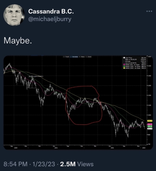 마이클 버리는 2000년부터 2003년까지의 모습이 담긴 S&P500 그래프에서 2001년 9월에 주목했다. 이 기간은 S&P500 지수가 단기 저점을 찍은 이후 최대 25% 가까이 상승했던 시기다. 다만 2002년 3월 이후 결국 추가적인 급락장이 펼쳐졌고 S&P500 지수는 2003년 말까지 40% 이상 폭락했다. 이를 두고 마이클 버리는 '아마도(Maybe)'라는 말을 트위터 게시글에 남기며 최근의 증시 상승랠리 뒤에 엄청난 폭락장이 다가올 수 있음을 시사했다.