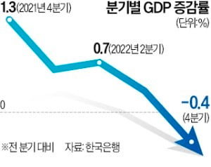 지난해 4분기 경제성장률이 전분기 대비 -0.4%(속보치)를 기록했다. 코로나19 확산 초기인 2020년 2분기(-3.0%) 후 2년6개월 만의 역성장이다. 그동안 버팀목 역할을 해온 민간소비가 꺾인 결과다. 고금리 여파로 소비가 더 악화하면 올해 1분기에도 마이너스 성장이 이어질 것이라는 분석이 나온다.
