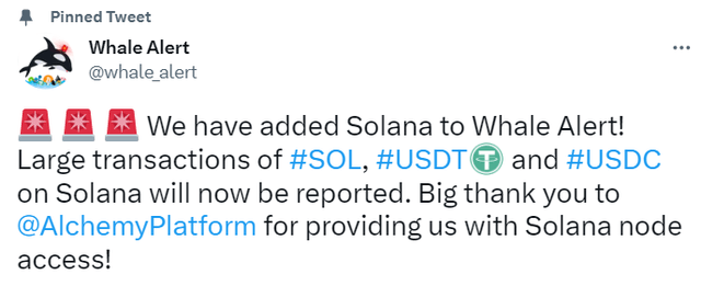 가상자산(암호화폐) 트랜잭션 추적 사이트 웨일 알러트(Whale Alert)가 26일(현지시간) 공식 트위터를 통해 "솔라나(SOL) 네트워크의 트랜잭션을 추가했다"며 "SOL와 솔라나 네트워크 기반 USDT, USDC의 대규모 이체를 확인할 수 있다"고 밝혔다.