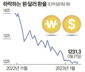서울 외환시장에서 원·달러 환율은 이달 초 1272원60전에서 27일 1231원30 전으로 41원30전(3.2%) 하락했다. 미국 내 인플레이션(물가 상승)이 둔화되고 경기침체 조짐은 뚜렷해진 여파다. 전문 가들은 이르면 올 상반기 Fed가 금리 인 상 사이클을 종료하고 연내 금리 인하에 들어갈 가능성이 있는 것으로 보고 있 다. 중국의 리오프닝(경제활동 재개)에 따라 위안화가 강세를 나타낸 것도 원· 달러 환율 하락에 한몫했다.