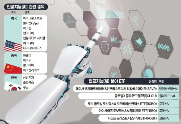 로봇 분야 기업들과 함께 구성된 ETF도 있다. '로보 글로벌 로보틱스& 오토메이션 인덱스 ETF(ROBO)' '아이셰어즈 로보틱스&AI 멀티섹터 ETF(IRBO)' '퍼스트 트러스트 나스닥 AI ETF(ROBT)' '글로벌 X 로봇&AI ETF(BOTZ)' 등이다. 글로벌X 핀테크 ETF(FINX), 글로벌X 원격의료&디지털 ETF(EDOC) 등도 AI 관련 수혜를 볼 만하다는 평가다.