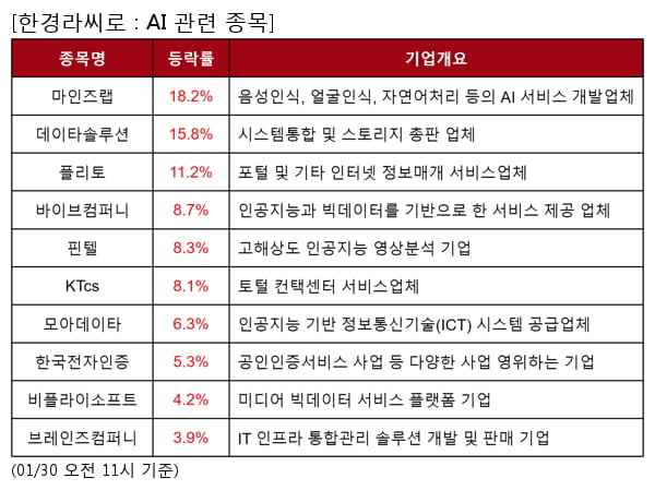 한경라씨로의 빅데이터 분석에 따르면, 01월 30일 AI,음원에 대한 투자자들의 관심이 높은 것으로 나타났다. 이 중 AI 관련 종목은 평균 9.0%의 상승세를 보이고 있다. AI 관련 종목으로는 마인즈랩,데이타솔루션,플리토,바이브컴퍼니,핀텔,KTcs,모아데이타,한국전자인증,비플라이소프트,브레인즈컴퍼니 등이 대표적인 종목으로 꼽히고 있다.