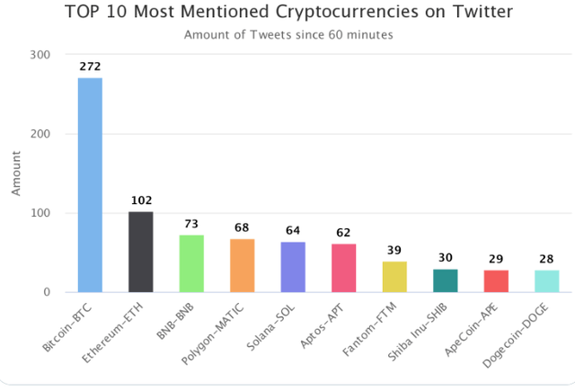 30일 가상자산(암호화폐) 마켓 데이터 플랫폼 코인트렌즈닷컴(CoinTrendz.com)에 따르면 이날 오후 2시 기준 1시간 동안 트위터에서 가장 많이 언급된 가상자산은 비트코인(BTC, 272회)으로 나타났다.