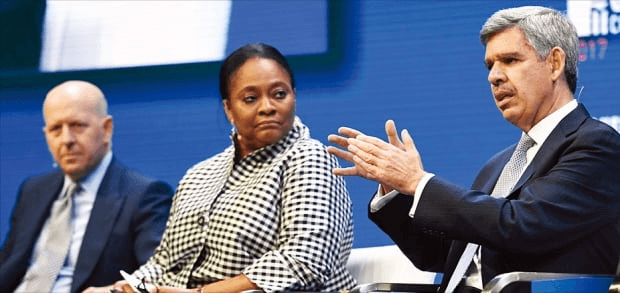 모하메드 엘 에리언 알리안츠 수석경제자문(오른쪽)은 1일(현지시간) 미국 로스앤젤레스 베벌리힐스힐튼호텔에서 열린 밀컨 글로벌 콘퍼런스에서 트럼프 정부의 경제정책이 모순적이라고 비판했다. 밀컨글로벌콘퍼런스 제공