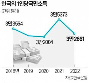 한국은행이 7일 발표한 '2022년 4분기 및 연간 국민소득(잠정)'에 따르면 지난해 한국의 1인당 GNI는 전년(3만5373달러) 대비 7.7% 줄어든 3만2661달러로 집계됐다. 1인당 GNI는 2017년 처음 3만달러(3만1734달러)를 돌파한 뒤 2018년 3만3564달러로 상승했지만, 2019년(3만2204달러)과 2020년(3만2038달러) 2년 연속 하락했다.