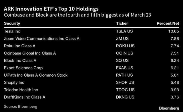 미국 최대의 암호화폐 거래소인 코인베이스는 현재 ARKK 포트폴리오에서 7.5%를 차지한다.