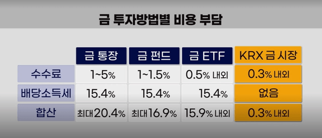 금은 투자방법에 따라 수익률이 최대 20%p 이상 벌어진다. 배당소득세, 거래 수수료, 실물인출 수수료 등 때문이다. 예를 들어 은행에서 손쉽게 만들 수 있는 '금 통장(골드뱅킹)'의 경우에는 계좌에 돈을 넣으면 이에 상당하는 금의 무게로 환산돼 통장에 기재되고 투자하는 형식인데, 매입할 때 기준가격의 1% 수수료를 떼고 시작한다. 여기에 15.4% 양도소득세가 부과되고 만약 골드바 실물로 인출을 하고자 한다면 거래가격의 10%를 부가가치세로 내야하며, 실물거래 수수료 5%를 추가로 부담해야 한다. 굳이 골드바로 인출하지 않는다 하더라도, -16.4%에서 투자를 시작하게 되는 셈이다.