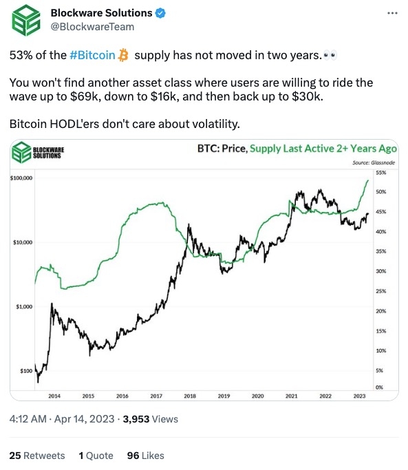 가상자산(암호화폐) 데이터 분석업체 블록웨어 솔루션스는 14일 트위터를 통해 "비트코인(BTC) 총 공급량의 53%에 해당하는 물량은 최근 2년간 기존 지갑에서 이동하지 않은 것으로 나타났다"라고 분석했다.