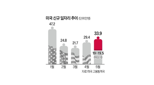 당초 시장에선 5월 취업자 수 증가폭이 19만 명대에 그칠 것으로 봤다. 다우존스는 19만 명, 월스트리트저널(WSJ)은 19만5000명 증가를 예상했다. 하지만 실제 증가폭은 33만9000명에 달했다. 4월(29만4000명)보다 4만 명 이상 증가했다.