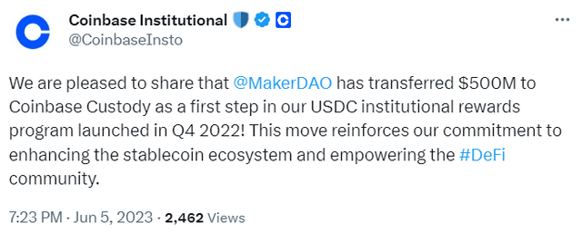 미국 가상자산(암호화폐) 거래소 코인베이스 산하 기관 전용 솔루션 코인베이스 인스티튜셔널(Coinbase Institutional)이 5일(현지시간) 공식 트위터를 통해 "메이커다오(MKR)가 5억달러를 코인베이스 커스터디로 이체했다"라며 "이는 스테이블코인 강화 및 디파이 커뮤니티 권한 부여와 관련된 약속의 일부분"이라고 밝혔다.