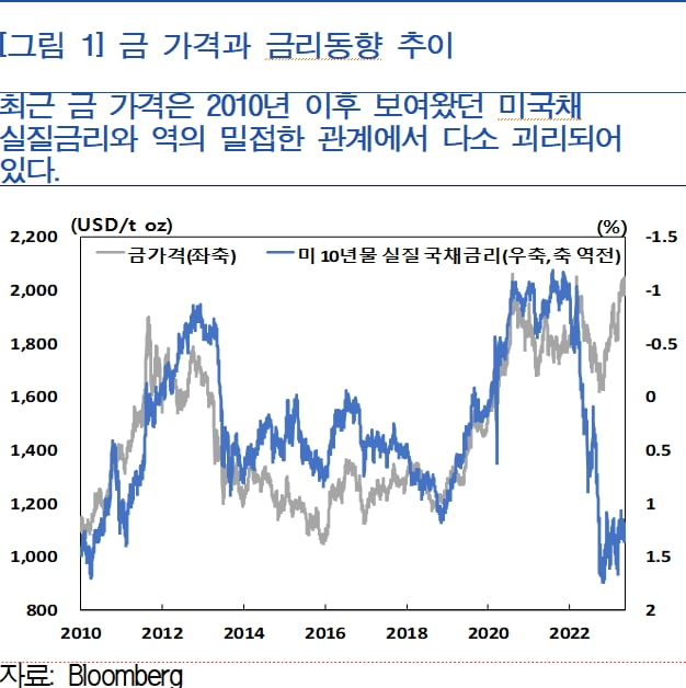 금 가격이 전고점에 근접한 상황이라는 점도 투자대상으로 매력이 떨어지는 점으로 꼽힌다. 최근 금 가격은 온스당 2000달러 수준에 육박했는데 이는 2010년대 중반 1100~1300달러 내외에 비해 크게 높은 수준이다. 금 보유의 기회비용인 실질금리가 플러스로 돌아선 것도 가격 상승 제약 요인이다.