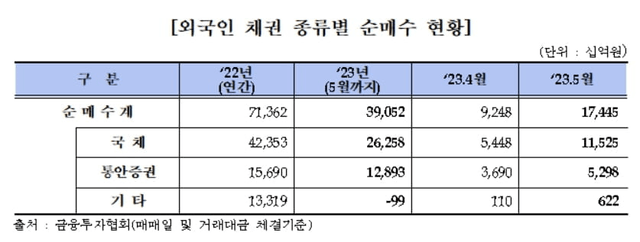 한국금융투자협회가 9일 발표한 '2023년 5월 장외채권시장 동향'에 따르면 외국인은 5월 중 국채 11조 5천억 원, 통안증권 5조 3천억 원 등 총 17조 4천억 원을 순매수했다. 이는 전월(9조 2,480억 원) 대비 88% 넘게 증가한 수치다.