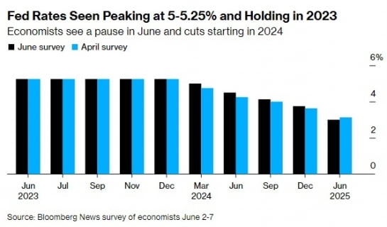 Fed가 6월 FOMC에서 매파적 행보를 보여줄 형식은 크게 두가지입니다. 첫째는 점도표와 경기전망을 통해 향후 금리 인상 여지를 남기는 것입니다. 3월 점도표에서 FOMC 위원들이 연말 금리 전망 중간값은 연 5.1%였습니다. 이 전망치를 6월 점도표에서 5.4% 가량으로 올리는 형태입니다.