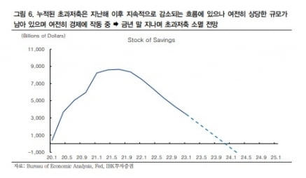 하지만 매파적 기조를 보일 요인도 적지 않습니다. 4월 이전에 비해 은행 위기 가능성이 줄면서 금융조건이 다소 완화됐습니다. 상업용 부동산 부실로 인한 은행 대출 축소도 아직까지는 가시적으로 보이지 않고 있습니다. 미국 가계의 초과저축은 아직도 건재합니다.