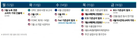 그런 상황을 확인할 수 있는 지표가 대거 나옵니다. 이번 주는 그야말로 인플레 주간입니다. 12일 뉴욕 연은의 5월 기대인플레율을 시작으로 13일 5월 CPI, 14일 PPI, 15일 소매판매, 16일 미시간대 5월 기대인플레율까지 물가 및 소비지표가 잇따라 공개됩니다. 여기서 인플레 완화가 계속 확인돼야 긴축 종말에 대한 기대가 커질 수 있습니다. 이런 상황에서 13일에 재닛 옐런 미 재무장관도 미 하원 금융위에 출석해 미국과 국제 금융 시장 상황에 대해 보고를 할 예정입니다.