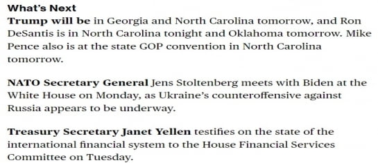 미국은 슬슬 차기 대선 모드로 진입하고 있습니다. 도널드 트럼프 전 대통령이 연방검찰에 기소된 뒤 처음으로 지난 주말 조지아와 노스캐롤라이나에서 유세를 했습니다. 론 디샌티스 플로리다 주지사와 마이크 펜스 전 부통령도 노스캐롤라이나에 모였습니다. 바이든 대통령은 17일에 필라델피아에서 대선 관련 연설을 합니다. 차기 대선 분위기가 무르익어 가는 것도 Fed의 통화정책에 적잖은 영향을 줄 전망입니다.