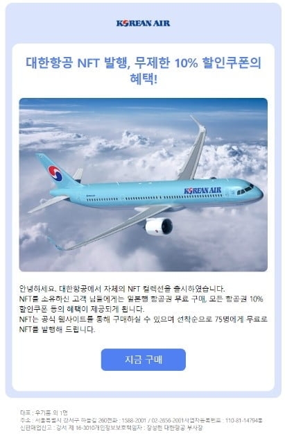 이메일에는 대한항공이 출시한 NFT를 소유하면 일본행 항공권 무료, 모든 항공권 10% 할인쿠폰 등의 혜택을 제공한다는 내용이 담겼다. 공식 웹사이트에서 판매하는 NFT를 선착순 75명에게 무료로 발행한다는 안내도 있다.