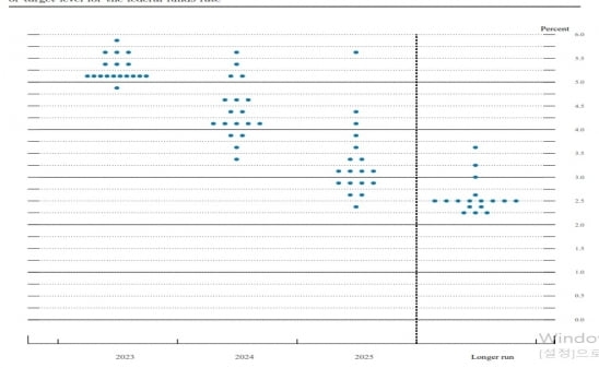 Fed가 6월 FOMC에서 매파적 행보를 보여줄 형식은 크게 두가지입니다. 첫째는 점도표와 경기전망을 통해 향후 금리 인상 여지를 남기는 것입니다. 3월 점도표에서 FOMC 위원들이 연말 금리 전망 중간값은 연 5.1%였습니다. 이 전망치를 6월 점도표에서 5.4% 가량으로 올리는 형태입니다.