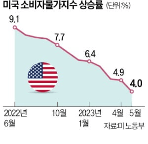 美 물가 2년 2개월來 최저…"금리동결 확실시"미 노동부는 13일 5월 CPI가 전년 동기 대비 4.0%(연율 기준) 올랐다고 발표했다. CPI 상승률은 지난해 6월 40년 만에 최고치인 9.1%까지 뛰었다가 11개월 연속 하락했다. 이달 수치는 2021년 3월(2.6%) 후 가장 낮은 수준이다.
