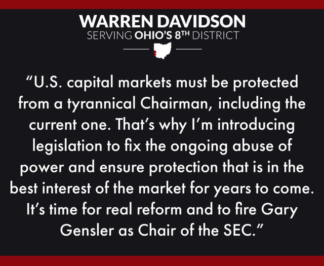 13일(현지시간) 워렌 데이비슨 미 하원의원은 트위터를 통해 "미 자본 시장은 폭압적인 의장(게리 겐슬러)으로부터 보호돼야 한다"라며 "진정한 개혁과 게리 겐슬러의 해고가 필요한 때"라며 이같이 밝혔다.